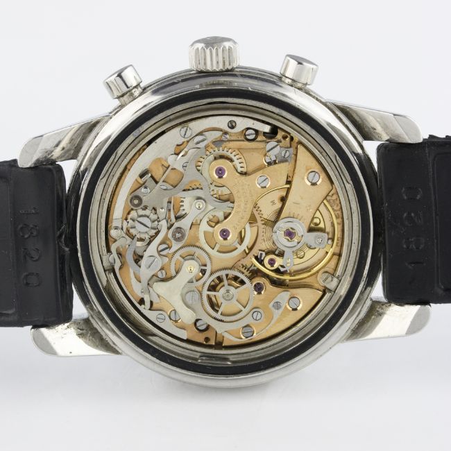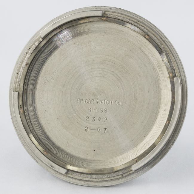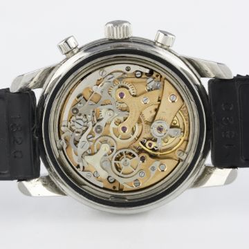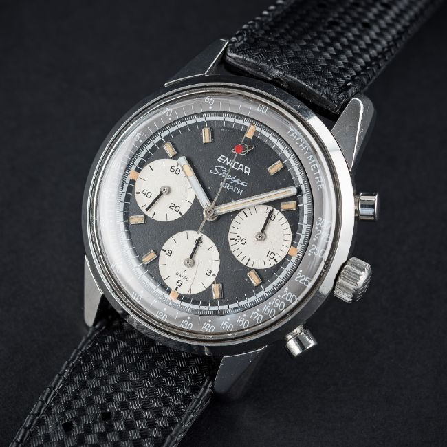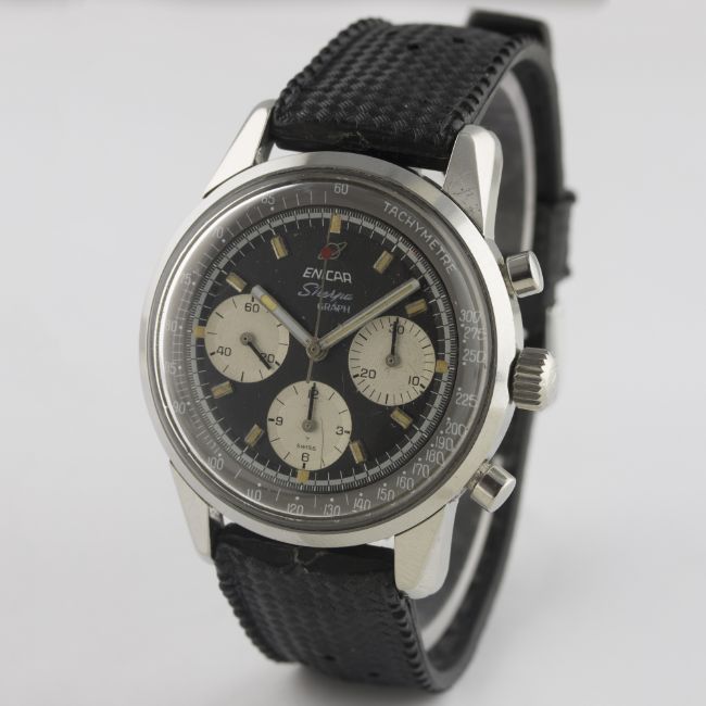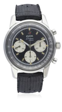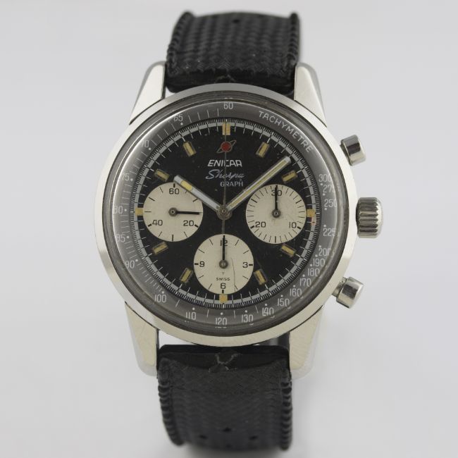 A RARE GENTLEMAN'S STAINLESS STEEL ENICAR SHERPA GRAPH CHRONOGRAPH WRIST WATCH CIRCA 1967 D: Black dial with luminous inlaid silver batons & hands, three silver registers recording hours, minutes & continuous seconds, grey inner bezel with tachymetre scale. M: 17 jewel manual wind movement signed Enicar, Valjoux calibre 72. C: Large circular screw back case, signed Enicar Watch Co. & numbered, Sherpa 300 emblem embossed on case back, Enicar anti-slip crown, case diameter measures approx. 40mm. S: Black rubber strap.CONDITION REPORT D: Original dial in excellent condition, a scratch to the bottom register. M: Working at present. C: In excellent condition, with some light scratches due to general use. S: In excellent condition. D: Dial / M: Movement / C: Case / S: Strap / B: Bracelet