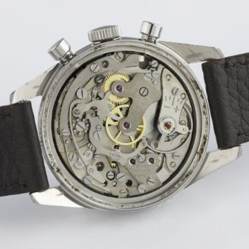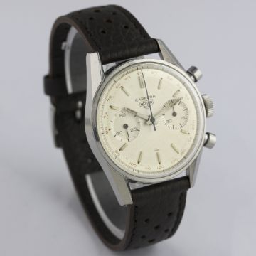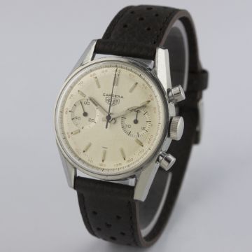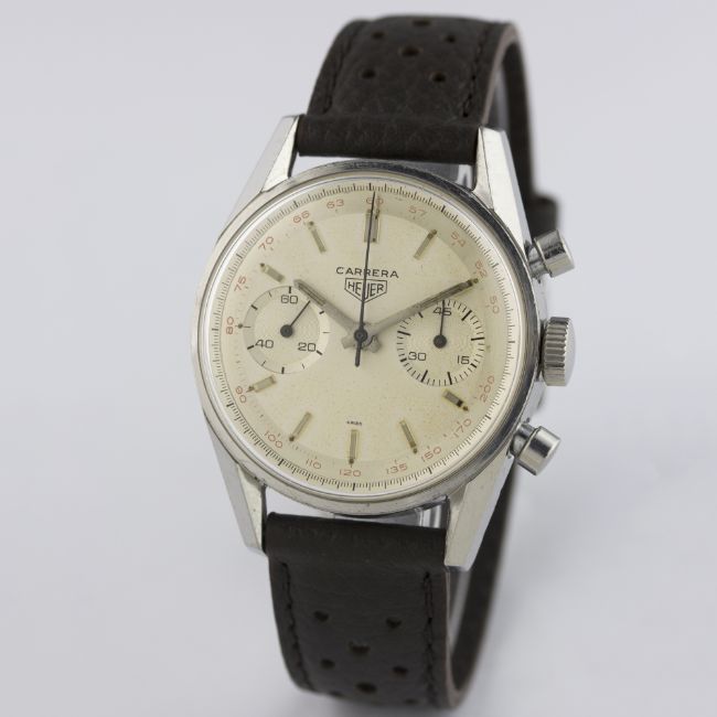 A VERY RARE GENTLEMAN'S STAINLESS STEEL HEUER CARRERA CHRONOGRAPH WRIST WATCH CIRCA 1960s, REF. 3647T D: Two tone silver dial with silver batons & hands, double register recording minutes & continuous seconds, outer red tachymetre scale. M: 17 jewel manual wind movement, signed Ed. Heuer & Co. S.A., Valjoux calibre 92. C: Classic Carrera case, signed Ed. Heuer & Co., numbered, case diameter measures approx. 36mm. S: Brown perforated leather strap.CONDITION REPORT D: Original dial in excellent condition, with some small signs of age. M: Working at present. C: In excellent condition, with light scratches due to general use. S: In excellent condition. D: Dial / M: Movement / C: Case / S: Strap / B: Bracelet