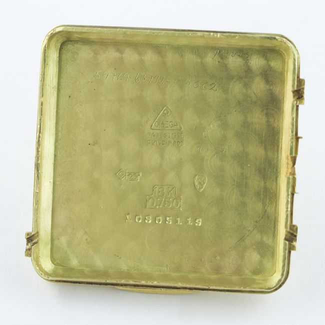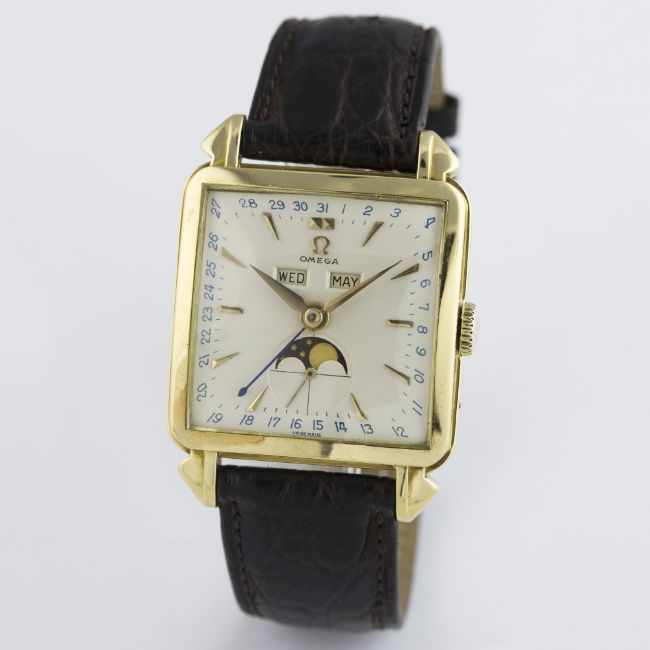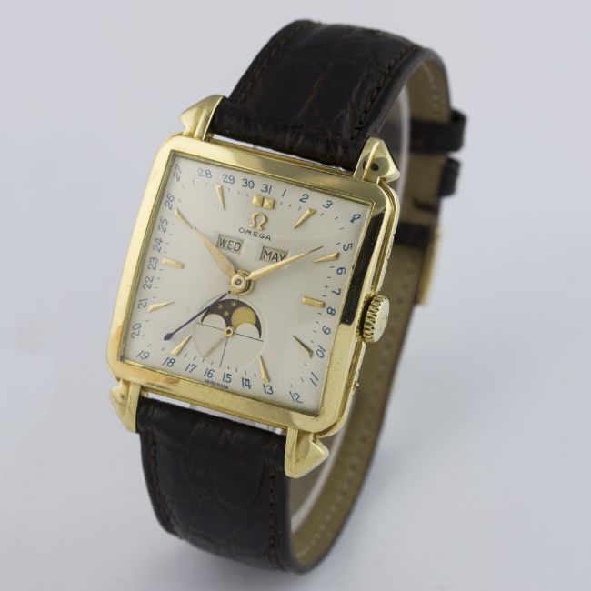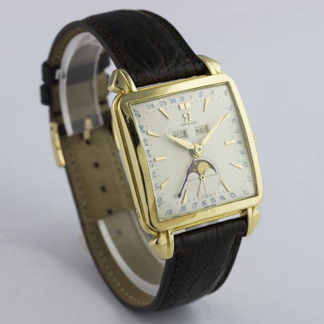 A RARE GENTLEMAN'S 18K SOLID GOLD OMEGA COSMIC MOONPHASE TRIPLE CALENDAR WRIST WATCH CIRCA 1951 D: Silver dial with gilt "dagger" batons & hands, day & month apertures, subsidiary seconds with moonphase display, outer date calendar. M: 17 jewel manual wind movement, signed Omega & numbered, calibre 381. C: Large square case, signed Omega, hallmarked & numbered, Omega crown, case width measures approx. 33mm. S: Black leather strap with a 9ct solid gold Omega pin buckle.CONDITION REPORT D: Dial in excellent condition. M: Working at present. C: In excellent condition, with some light scratches due to general use. S: In very good condition. D: Dial / M: Movement / C: Case / S: Strap / B: Bracelet
