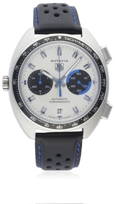 A GENTLEMAN'S STAINLESS STEEL TAG HEUER AUTAVIA AUTOMATIC CHRONOGRAPH WRIST WATCH DATED 2006, REF. CY2110 JO SIFFERT RE-EDITION, WITH BOX & PAPERS D: Silver dial with blue & luminous inlaid silver batons & hands, two black registers with blue details recording minutes & continuous seconds, date aperture at 6 o'clock, blue chronograph hands. M: Automatic movement signed TAG Heuer. C: Tonneau shaped case with tachymetre bezel, signed TAG Heuer Autavia & numbered, original crown & pushers, case width measures approx. 43mm. S: Black leather perforated strap with blue stitching. CONDITION REPORT D: Original dial in excellent condition. M: Working at present. C: In excellent condition. S: In excellent condition. D: Dial / M: Movement / C: Case / S: Strap / B: Bracelet