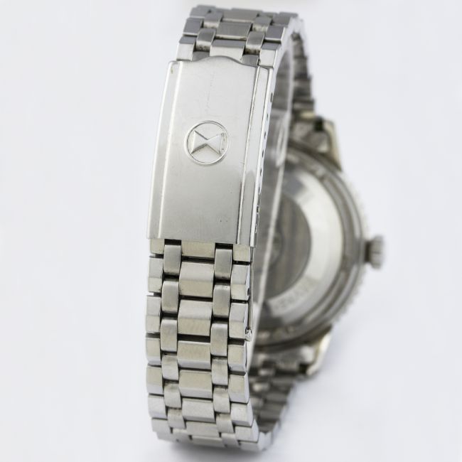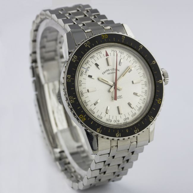 A RARE GENTLEMAN'S STAINLESS STEEL FAVRE LEUBA BIVOUAC ALTIMETER BAROMETER BRACELET WATCH CIRCA 1960s, REF. 53203 D: Silver dial with faceted silver batons & hands, outer scale with red pressure gauge hand. M: Manual wind movement signed Favre-Leuba. C: Circular case with air pressure capsule, black rotating bakelite bezel, signed Favre-Leuba Bivouac & numbered, original crown, case diameter measures approx. 40mm. B: Original Favre-Leuba stainless steel bracelet.CONDITION REPORT D: Original dial in excellent condition. M: Working at present. C: In excellent condition, with some light scratches due to general use. B: In excellent condition, with some light scratches. D: Dial / M: Movement / C: Case / S: Strap / B: Bracelet