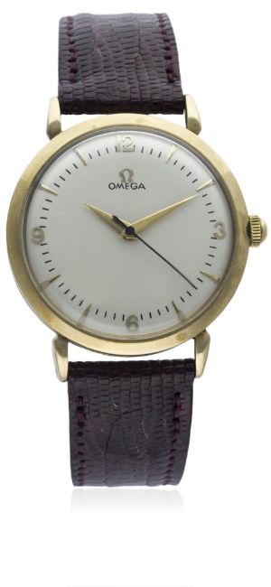 A GENTLEMAN'S 9CT SOLID GOLD OMEGA AUTOMATIC WRIST WATCH CIRCA 1956 D: Silver dial with gilt "dagger" batons & quarterly Arabic numerals. M: 19 jewel automatic movement signed Omega Watch Co & numbered, calibre 501. C: Circular case with "horn" lugs, signed Dennison Made in England & Omega Watch Co., hallmarked & numbered, case diameter measures approx. 35mm. S: Brown leather strap with original Omega 9ct solid gold pin buckle.CONDITION REPORT D: Dial in excellent condition. M: Working at present. C: In excellent condition, with some light scratches due to general use, plexiglass has crazed. S: In very good condition. D: Dial / M: Movement / C: Case / S: Strap / B: Bracelet