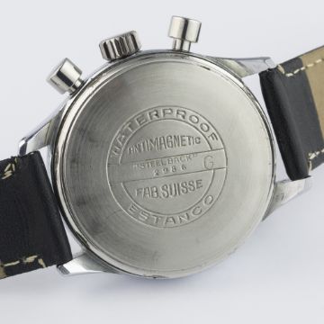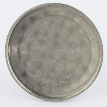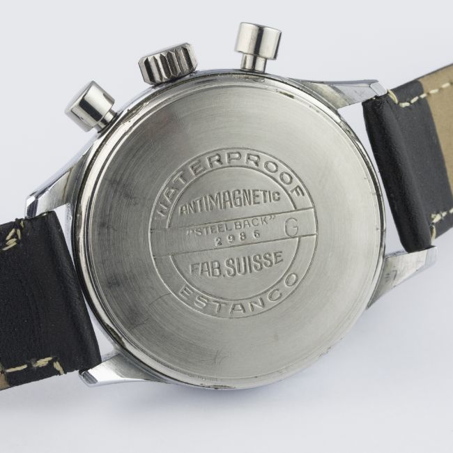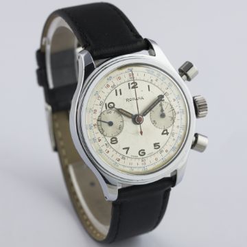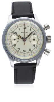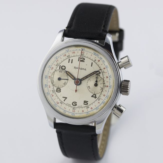 A GENTLEMAN'S LARGE SIZE STAINLESS STEEL RODANA ANTIMAGNETIC WATERPROOF CHRONOGRAPH WRIST WATCH CIRCA 1950 D: Silver dial with luminous Arabic numerals & "syringe" hands, double register recording minutes & continuous seconds, outer telemetre & tachymetre scales. M: 17 jewel manual wind movement, signed Rodana Watch Co. C: Circular screw back case, signed Rodana Watch Co.  & numbered, case diameter measures approx. 37mm. S: Black leather strap.CONDITION REPORT D: Original dial in very good condition, with some signs of age. M: Working at present. C: In excellent condition, with some light scratches due to general use. S: In excellent condition. D: Dial / M: Movement / C: Case / S: Strap / B: Bracelet