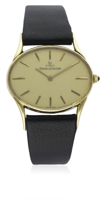 A GENTLEMAN'S 18K SOLID GOLD JAEGER LECOULTRE WRIST WATCH CIRCA 1970s D: Champagne dial with gilt batons & hands. M: Manual wind movement signed Jaeger-LeCoultre & numbered, calibre 838/1. C: Oval shaped case with "horn" lugs, signed LeCoultre Co & numbered, 18k hallmarks, jewel set crown, case width measures approx. 35mm. S: Black leather strap.CONDITION REPORT D: Original dial in excellent condition. M: Working at present. C: In excellent condition, with some light scratches due to general use. S: In fair condition. D: Dial / M: Movement / C: Case / S: Strap / B: Bracelet