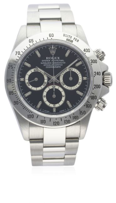 A RARE GENTLEMAN'S STAINLESS STEEL ROLEX OYSTER PERPETUAL COSMOGRAPH "PATRIZZI" DAYTONA BRACELET WATCH DATED 1999, REF. 16520 WITH BOX & PAPERS D: Black dial with luminous inlaid white gold batons, triple register with silver rings showing a light patina, recording hours, minutes & continuous seconds. M: 31 jewel automatic chronometer movement, signed Montres Rolex S.A. & numbered, Zenith El Primero base movement calibre 4030. C: Oyster case with units per hour bezel, sapphire crystal, signed Montres Rolex S.A., U serial no., Rolex screw down crown & pushers, case diameter measures approx. 39mm. B: Original Rolex Oyster Daytona bracelet, numbered U9/78390A/803.CONDITION REPORT D: Original dial in excellent condition. M: Working at present. C: In excellent condition. B: In excellent condition. D: Dial / M: Movement / C: Case / S: Strap / B: Bracelet