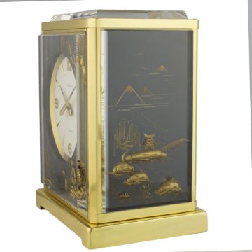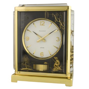 A FINE & RARE JAEGER LECOULTRE MARINA ATMOS CLOCK CIRCA 1960s Silver dial with quarterly Arabic numerals & faceted "dagger" batons, 4 sided brass case with oriental designed Lucite panels, measures approx. 23cm by 17.8cm by 15.5cm. The clock gets energy from minute temperature and pressure variations in the atmosphere and a change of just 1 degree (Celsius) between the range of 15 to 30 degrees is enough to power the clock for 2 days. Designed for minimal power consumption, wear and resistance, its movement beats just twice per minute, 60 times less than a conventional clock and 240 times less than a wristwatch movement.CONDITION REPORT D: Original dial in excellent condition. M: Working at present. C: In excellent condition. D: Dial / M: Movement / C: Case / S: Strap / B: Bracelet