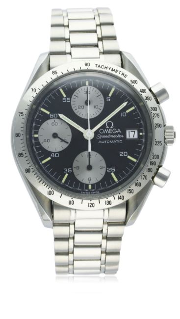 A GENTLEMAN'S STAINLESS STEEL OMEGA SPEEDMASTER AUTOMATIC CHRONOGRAPH BRACELET WATCH CIRCA 1992, ALBERTVILLE 1992 WINTER OLYMPICS LIMITED EDITION OF 500 PIECES D: Black dial with luminous markers, three silver registers recording hours, minutes & continuous seconds. M: Automatic movement, signed Omega & numbered. C: Circular case with tachymetre bezel, signed Omega Watch Co, Omega crown & pushers, case diameter measures approx. 39mm. B: Omega Speedmaster bracelet, numbered 32/1469/83.CONDITION REPORT D: Original dial in excellent condition. M: Working at present. C: In excellent condition with some light scratches around the bezel S: In excellent condition. D: Dial / M: Movement / C: Case / S: Strap / B: Bracelet