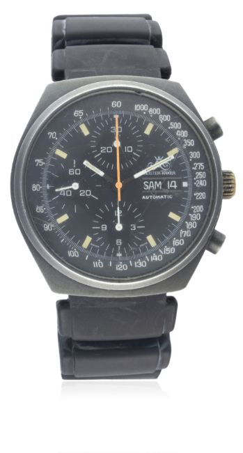A GENTLEMAN'S PVD COATED MEISTER ANKER AUTOMATIC CHRONOGRAPH WRIST WATCH CIRCA 1970s D: Black dial with luminous markers, triple register recording hours, minutes & continuous seconds, day & date apertures, inner tachymeter bezel. M: 17 jewel automatic movement, Valjoux calibre 7750. C: Tonneau shaped case, signed Itika Watch Swiss, numbered, original crown & pushers, case width measures approx. 41mm. S: Black rubber strap.CONDITION REPORT D: Original dial in excellent condition. M: Working at present. C: In good condition with some small scratches due to general use, crystal is heavily scratched and crown is fairly worn. S: In good condition. D: Dial / M: Movement / C: Case / S: Strap / B: Bracelet