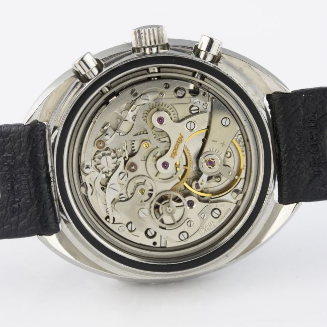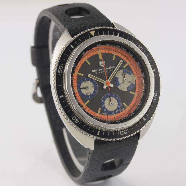 A RARE GENTLEMAN'S STAINLESS STEEL NIVADA GRENCHEN CHRONOKING CHRONOGRAPH WRIST WATCH CIRCA 1970 D: Black dial with luminous markers, orange surround with minutes & seconds tracking, three silver & blue registers recording hours, minutes & continuous seconds. M: 17 jewel manual wind movement signed Nivada, Valjoux calibre 72. C: Tonneau shaped case with rotating 60 minute bakelite bezel, inner tachymetre bezel, signed Nivada Grenchen & numbered, case width measures approx. 44mm. S: Black Tropic Sport rubber strap.CONDITION REPORT D: Original dial in excellent condition, with some small signs of age. M: Working at present. C: In excellent condition, with some light scratches due to general use. S: In excellent condition. D: Dial / M: Movement / C: Case / S: Strap / B: Bracelet