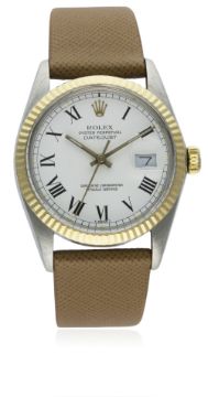 A GENTLEMAN'S STEEL & GOLD ROLEX OYSTER PERPETUAL DATEJUST WRIST WATCH CIRCA 1987, REF. 16013  D: White "Buckley" dial with black Roman numerals, date aperture. M: 27 jewel automatic chronometer movement with quick set date, signed Rolex S.A. & numbered, calibre 3035. C: Oyster case with solid gold fluted bezel, signed Montres Rolex S.A., numbered, Rolex crown, case diameter measures approx. 36mm. S: Brown leather strap.CONDITION REPORT D: Original dial in excellent condition. M: Working at present. C: In excellent condition. S: In excellent condition. D: Dial / M: Movement / C: Case / S: Strap / B: Bracelet