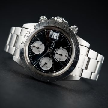 A GENTLEMAN'S STAINLESS STEEL ROLEX TUDOR OYSTERDATE CHRONO TIME "BIG BLOCK" CHRONOGRAPH BRACELET WATCH CIRCA 1990, REF. 79180 WITH TUDOR BOX D: Black dial with silver batons & hands, three silver registers recording hours, minutes & continuous seconds, date aperture. M: 17 jewel automatic movement signed Tudor. C: Circular case with units per hour bezel, signed Montres Tudor S.A., numbered, Rolex screw down crown & pushers, case diameter measures approx. 40mm. B: Rolex Tudor Oyster bracelet, numbered R11/78360/589.CONDITION REPORT D: Original dial in excellent condition, showing some small signs of age. M: Working at present. C: In excellent condition, with some light scratches due to general use. B: In excellent condition, with some light scratches. D: Dial / M: Movement / C: Case / S: Strap / B: Bracelet