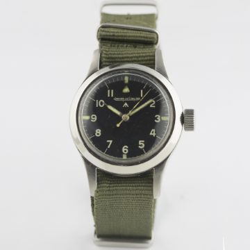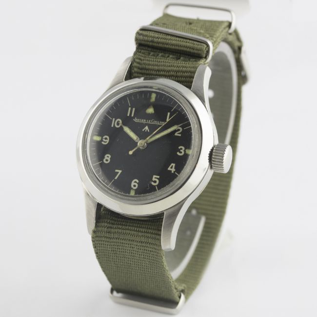 A VERY RARE GENTLEMAN'S STAINLESS STEEL BRITISH MILITARY JAEGER LECOULTRE MARK 11 RAF PILOTS WRIST WATCH DATED 1948 D: Black dial with Arabic numerals, luminous markers & "syringe" hands, military arrow. M: Manual wind movement with hacking seconds, signed Jaeger-LeCoultre & numbered, military arrow, calibre 488/8. C: Military case with fixed bars, signed LeCoultre Co, issue markings ^ 6B/346 3006/48, dust cover, case diameter measures approx. 35mm. S: Green NATO strap.CONDITION REPORT D: Original dial in excellent condition, showing some small signs of age. M: Working at present. C: In excellent condition, has been polished. S: New. D: Dial / M: Movement / C: Case / S: Strap / B: Bracelet