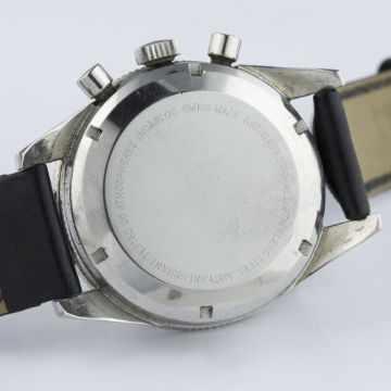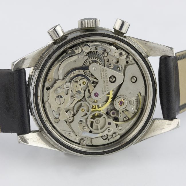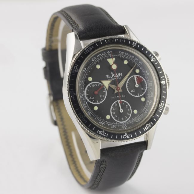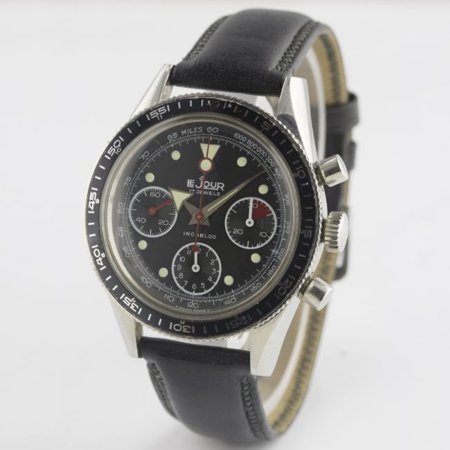 A RARE GENTLEMAN'S STAINLESS STEEL LEJOUR CHRONOGRAPH WRIST WATCH CIRCA 1960s  D: Black dial with luminous markers & steel broad arrow hands, triple register recording hours, minutes & continuous seconds, red "lollipop" centre chronograph hand, outer tachymetre scale. M: 17 jewel manual wind movement signed J.P. Pingouin Co, Valjoux calibre 7736. C: Circular case with rotating MH bezel, signed J.P. Pingouin Co, case diameter measures approx. 39mm. S: Black leather strap. CONDITION REPORT D: Original dial in excellent condition. M: Working at present. C: In excellent condition, with some light scratches due to general use. S: In excellent condition. D: Dial / M: Movement / C: Case / S: Strap / B: Bracelet
