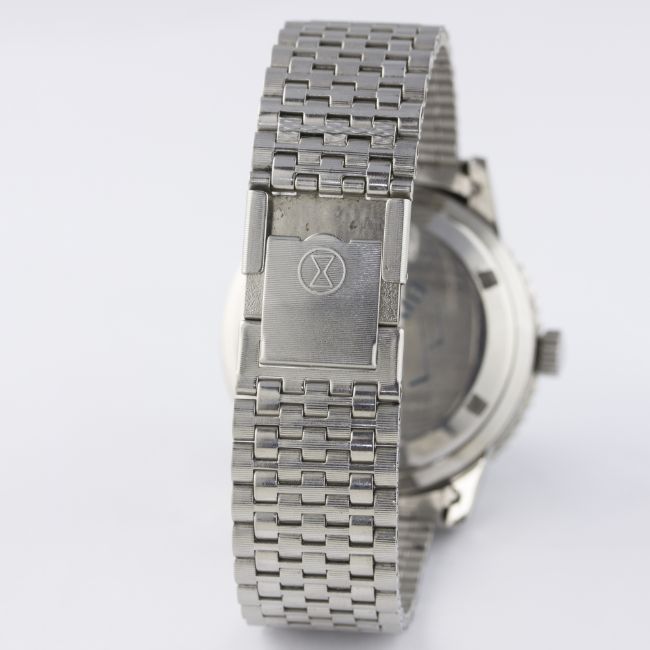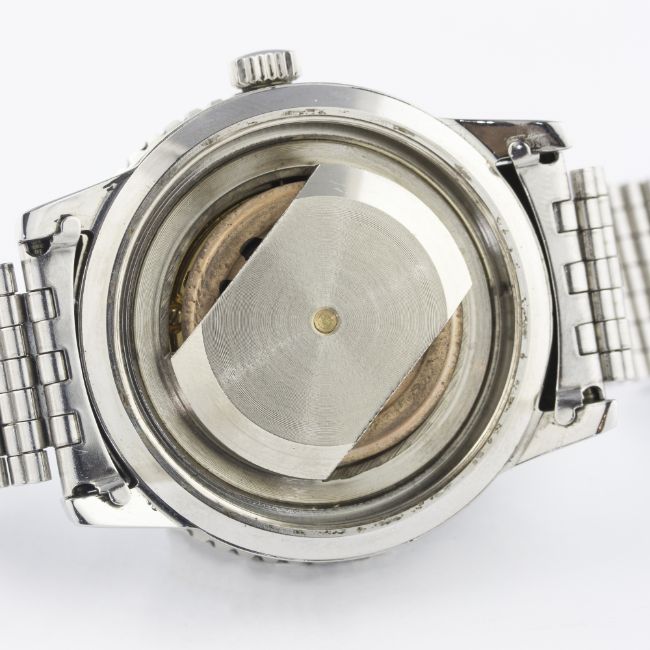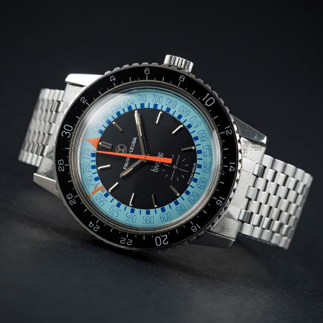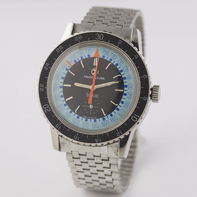 A RARE GENTLEMAN'S STAINLESS STEEL FAVRE LEUBA BIVOUAC ALTIMETER BAROMETER BRACELET WATCH CIRCA 1960s, REF. 53223 D: Blue & black dial with faceted silver batons & hands, outer scale with orange pressure gauge hand, subsidiary seconds. M: Manual wind movement, signed Favre-Leuba. C: Circular case with air pressure capsule, black rotating bakelite bezel, signed Bivouac Altimeter Barometer & numbered, case diameter measures approx. 40mm. B: Stainless steel Favre-Leuba NSA bracelet. CONDITION REPORT D: Original dial in excellent condition. M: Working at present. C: In excellent condition. B: In excellent condition. D: Dial / M: Movement / C: Case / S: Strap / B: Bracelet