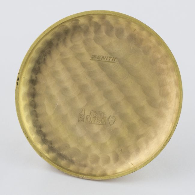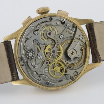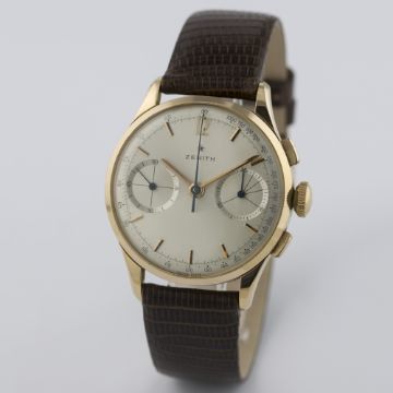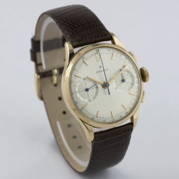 A RARE GENTLEMAN'S 18K SOLID PINK GOLD ZENITH CHRONOGRAPH WRIST WATCH CIRCA 1960s D: Silver sunburst dial with pink gold batons & hands, double register recording minutes & continuous seconds, outer tachymetre scale. M: Manual wind movement signed Zenith, calibre 146D. C: Circular case, signed Zenith & numbered, 18k hallmarks, case diameter measures approx. 35mm. S: Black leather strap.CONDITION REPORT D: Original dial in excellent condition. M: Working at present. C: In excellent condition, with some light scratches due to general use. S: In excellent condition. D: Dial / M: Movement / C: Case / S: Strap / B: Bracelet