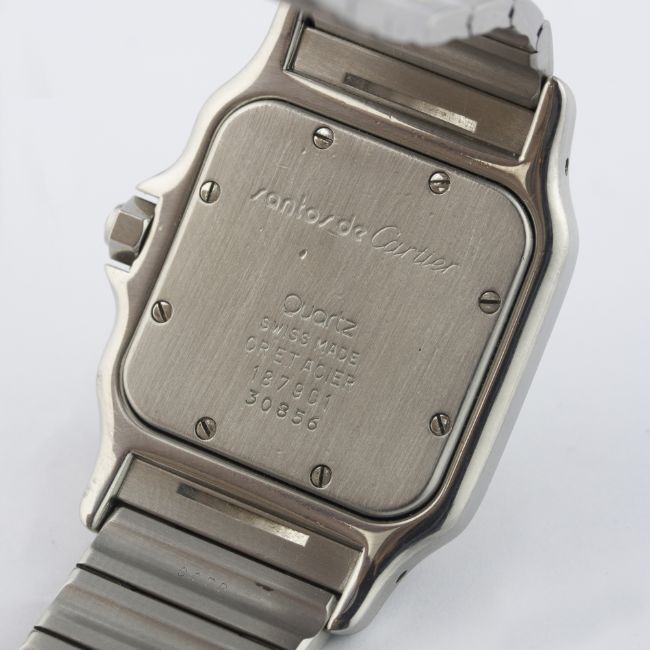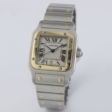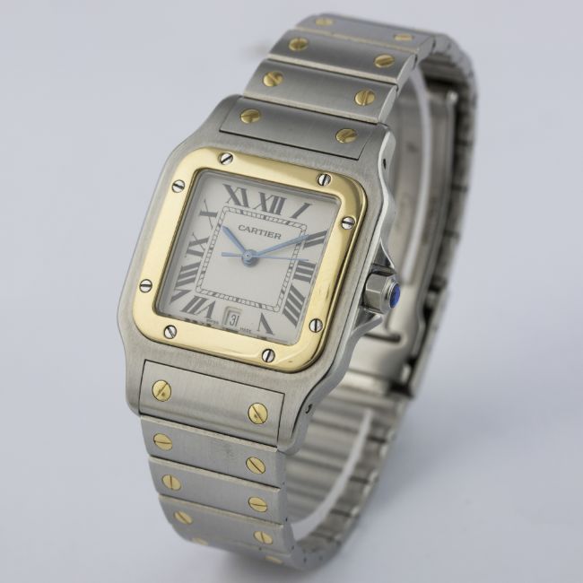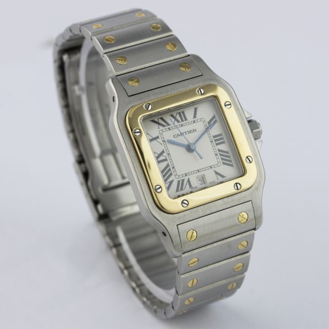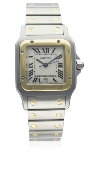 A GENTLEMAN'S STEEL & GOLD CARTIER SANTOS GALBEE BRACELET WATCH CIRCA 1990s, REF. 187901 WITH CARTIER BOX  D: Silver dial with black Roman numerals & inner minute track, secret signature at VII, date aperture. M: Quartz movement signed Cartier. C: Square Santos case with solid gold bezel, signed santos de Cartier & numbered, original sapphire crown, case width measures approx. 29mm. B: Original Cartier steel & solid gold bracelet, comes with 3 additional Cartier leather straps & stainless steel deployment clasp. CONDITION REPORT D: Original dial in excellent condition. M: Working at present. C: In excellent condition, with some light surface scratches due to general use. B: In excellent condition, with some light scratches due to general use. D: Dial / M: Movement / C: Case / S: Strap / B: Bracelet
