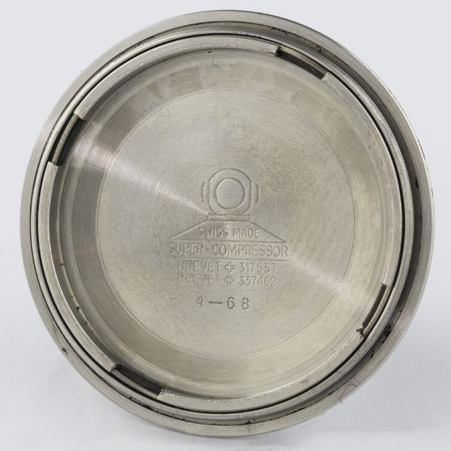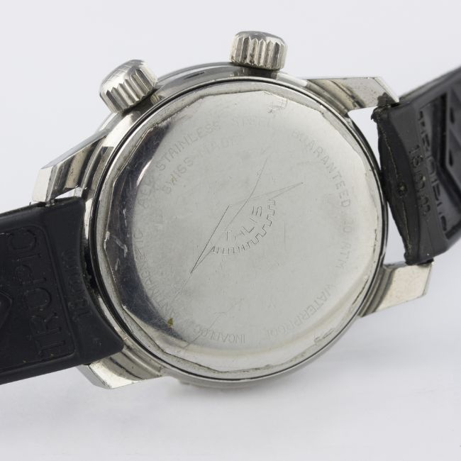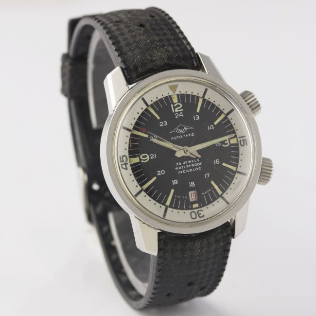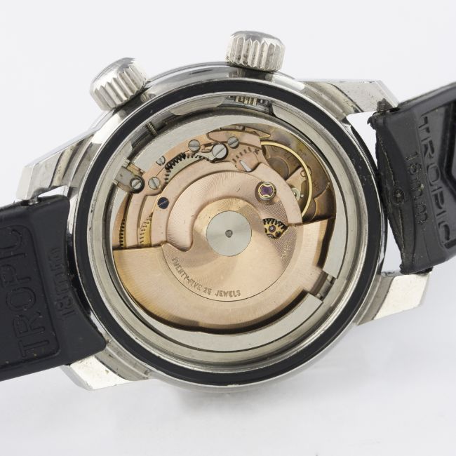 A GENTLEMAN’S STAINLESS STEEL TALIS SUPER COMPRESSOR WRIST WATCH CIRCA 1968 D: Black dial with 24 hour Arabic numerals, luminous markers & hands, date aperture, inner rotating 60 minute bezel. M: 25 jewel automatic incabloc movement, ETA calibre 2472. C: Circular Super-Compressor case with anti-slip crowns, signed Talis, case diameter measures approx. 37mm. S: Black Tropic rubber strap.CONDITION REPORT D: Original dial in excellent condition. M: Working at present. C: In excellent condition, with light scratches due to general use. S: In excellent condition. D: Dial / M: Movement / C: Case / S: Strap / B: Bracelet