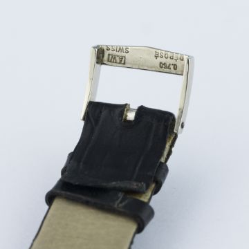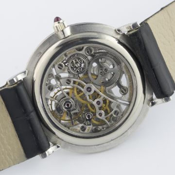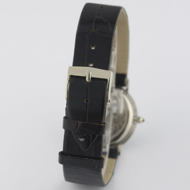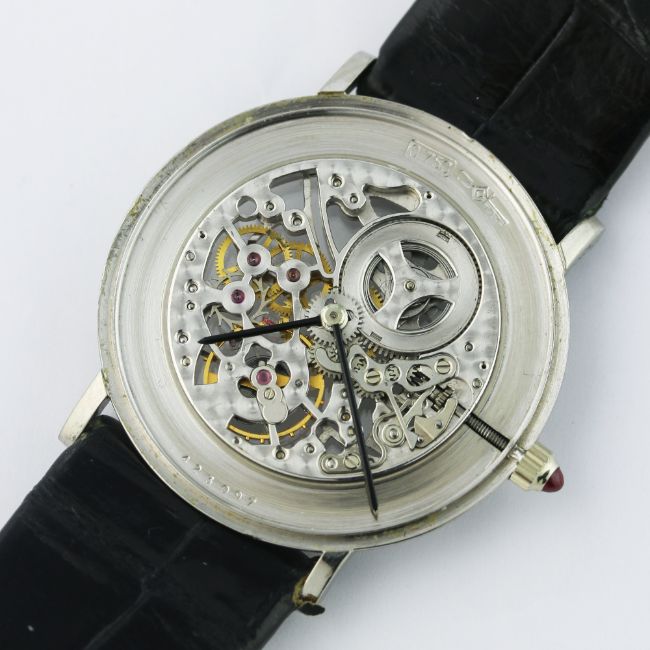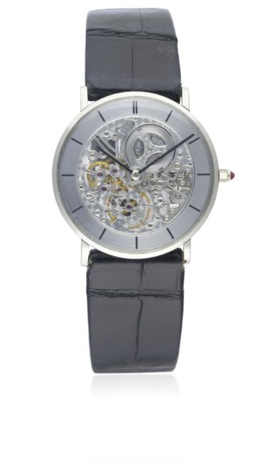A FINE & RARE GENTLEMAN'S 18K SOLID WHITE GOLD VACHERON & CONSTANTIN WRIST WATCH MANUFACTURED IN 1967, REF. 7066 D: Skeletonised dial with solid white gold surround, black hour markers & hands. M: 17 jewel manual wind movement signed Vacheron & Constantin, calibre 1003. C: Slim circular case with exhibition back, 18k hallmarks, numbered underneath the dial, ruby set crown, case diameter measures approx. 30mm. S: Black leather strap with original Vacheron & Constantin 18k solid white gold pin buckle.CONDITION REPORT D: Original dial in excellent condition. M: Working at present. C: In excellent condition, with some light scratches due to general use. S: In very good condition. D: Dial / M: Movement / C: Case / S: Strap / B: Bracelet