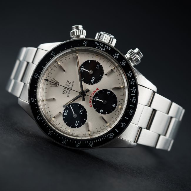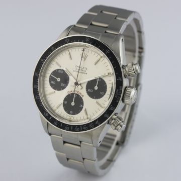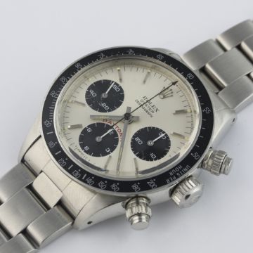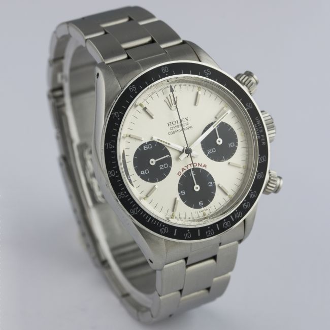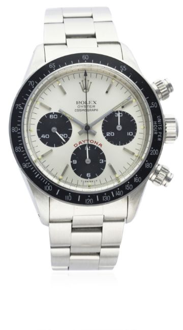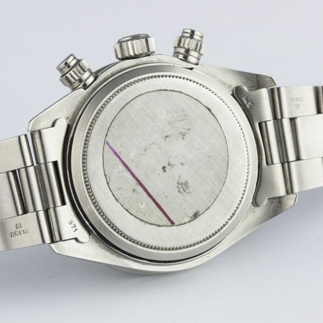 A RARE GENTLEMAN'S STAINLESS STEEL ROLEX OYSTER COSMOGRAPH DAYTONA BRACELET WATCH CIRCA 1978, REF. 6265 "BIG RED" D: Silver dial with silver batons, three black registers recording hours, minutes & continuous seconds. M: 17 jewel manual wind movement, signed Montres Rolex S.A. & numbered, calibre 727. C: Oyster case with reference 6263 bakelite units per hour bezel, signed Montres Rolex S.A., Rolex screw down crown & pushers, case diameter measures approx. 38mm. B: Rolex Oyster bracelet, numbered F/78350/19/571.CONDITION REPORT D: Original dial in excellent condition. M: Working at present. C: In excellent condition, with some light scratches due to general use. B: In excellent condition, with light scratches. D: Dial / M: Movement / C: Case / S: Strap / B: Bracelet