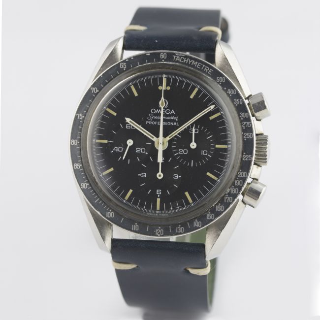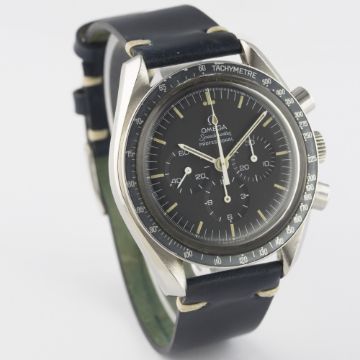 A GENTLEMAN'S STAINLESS STEEL OMEGA SPEEDMASTER PROFESSIONAL CHRONOGRAPH WRIST WATCH CIRCA 1974, REF. 145.022-74 ST D: Black dial with luminous markers & hands, triple register recording hours, minutes & continuous seconds. M: 17 jewel manual wind movement, signed Omega & numbered, calibre 861. C: Circular case with tachymetre bezel faded to blue, signed Omega Watch Co., Speedmaster emblem embossed on case back with NASA moon landing tribute, dust cover, Omega crown & pushers, case diameter measures approx. 42mm. S: Dark blue Horween leather strap.CONDITION REPORT D: Original dial in excellent condition. M: Working at present. C: In very good condition, with some small scratches due to general use, bezel insert nicely faded. S: In excellent condition. D: Dial / M: Movement / C: Case / S: Strap / B: Bracelet