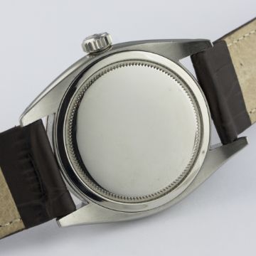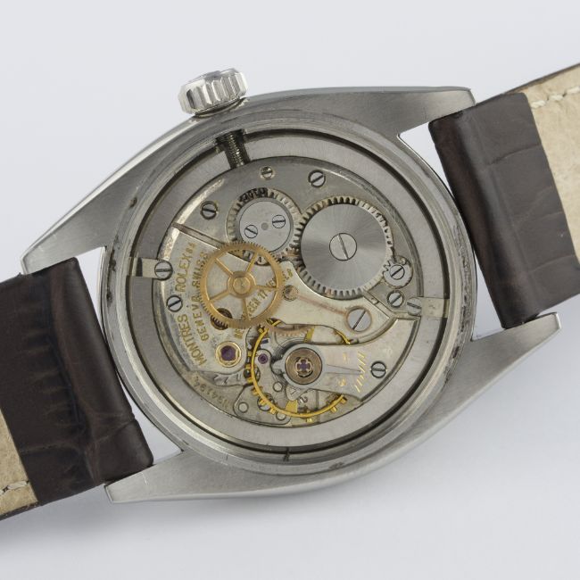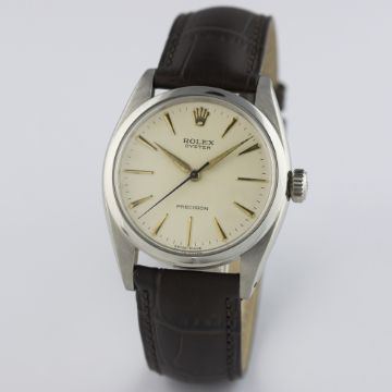 A GENTLEMAN'S STAINLESS STEEL ROLEX OYSTER PRECISION WRIST WATCH CIRCA 1959, REF. 6426 / 6427  D: Silver dial with gilt "dagger" batons & hands. M: 17 jewel manual wind movement, signed Montres Rolex S.A. & numbered, calibre 1210. C: Oyster case, signed Montres Rolex S.A., dated II.59, numbered, Rolex crown, case diameter measures approx. 35mm. S: Brown leather strap.CONDITION REPORT D: Dial in excellent condition. M: Working at present. C: In excellent condition. S: New. D: Dial / M: Movement / C: Case / S: Strap / B: Bracelet