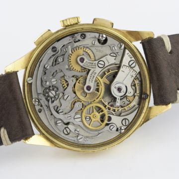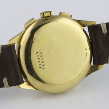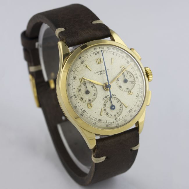 A RARE GENTLEMAN'S LARGE SIZE 18K SOLID GOLD UNIVERSAL GENEVE COMPAX CHRONOGRAPH WRIST WATCH CIRCA 1950, REF. 124115 D: Silver dial with gilt Arabic numerals & dagger batons, triple register recording hours, minutes & continuous seconds, inner minute track, outer base scale. M: 17 jewel manual wind movement signed Universal Geneve, calibre 285. C: Circular case, signed Universal Geneve & numbered, 18k hallmarks, case diameter measures approx. 37mm. S: Brown leather Bulang & Sons strap.CONDITION REPORT D: Original dial in very good condition, showing a nice even patina and some small signs of age. M: Working at present. C: In excellent condition, with some small scratches due to general use. S: In excellent condition. D: Dial / M: Movement / C: Case / S: Strap / B: Bracelet