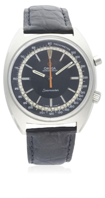 A GENTLEMAN'S LARGE SIZE STAINLESS STEEL OMEGA SEAMASTER CHRONOSTOP WRIST WATCH CIRCA 1968, REF. 145.007 D: Black dial with silver batons, "chequered flag" tracking, orange centre chronograph hand, tachymetre inner bezel. M: 17 jewel manual wind movement, signed Omega & numbered, calibre 865. C: Tonneau shaped case, signed Omega Watch Co., Seamaster emblem on case back, Omega crown & pusher, case width measures approx. 41mm. S: Black leather strap.CONDITION REPORT D: Original dial in excellent condition, with some small signs of age. M: Working at present. C: In excellent condition. S: In fair condition. D: Dial / M: Movement / C: Case / S: Strap / B: Bracelet