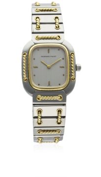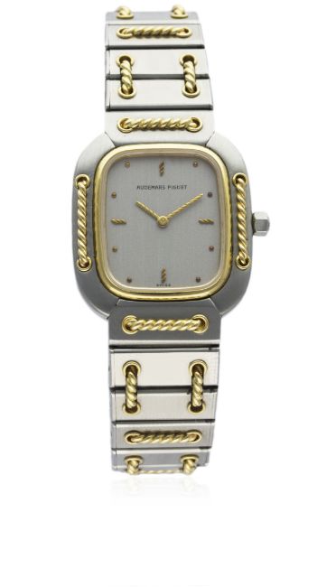 A LADIES STEEL & GOLD AUDEMARS PIGUET BRACELET WATCH CIRCA 1990s, WITH ORIGINAL STOCK TAG D: Brushed silver dial with gilt hour markers & hands. M: Quartz movement signed Audemars Piguet. C: Oblong shaped case with solid gold bezel & details, numbered, original crown, case width measures approx. 24mm. B: Original AP stainless steel bracelet with solid gold details.CONDITION REPORT D: Original dial in excellent condition. M: Working at present. C: In excellent condition. B: In excellent condition. Overall the watch appears unworn for new. D: Dial / M: Movement / C: Case / S: Strap / B: Bracelet