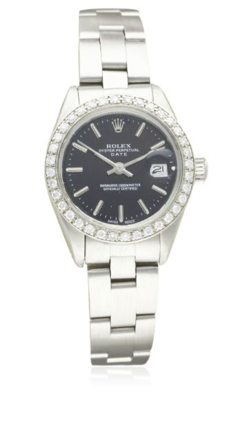 A LADIES STAINLESS STEEL ROLEX OYSTER PERPETUAL DATE BRACELET WATCH CIRCA 1977, REF. 6916 D: Black dial with silver batons & hands, date aperture. M: 28 jewel automatic chronometer movement, signed Rolex & numbered, calibre 2030. C: Oyster case with after-set diamond bezel, signed Montres Rolex S.A., numbered, Rolex crown, case diameter measures approx. 26mm. B: Rolex Oyster bracelet, numbered DT3/78240/566B.CONDITION REPORT D: Original dial in excellent condition. M: Working at present. C: In excellent condition, with some light scratches due to general use. B: In very good condition. D: Dial / M: Movement / C: Case / S: Strap / B: Bracelet