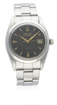 A RARE GENTLEMAN'S STAINLESS STEEL ROLEX OYSTERDATE PRECISION BRACELET WATCH CIRCA 1956, REF. 6494 WITH "TROPICAL HONEYCOMB" DIAL D: Black "honeycomb" dial with gilt dagger batons & hands, gilt font & tracking, black & red "roulette" date display. M: 17 jewel manual wind movement signed Montres Rolex S.A. & numbered, calibre 1210. C: Oyster case, signed Montres Rolex S.A., numbered, dated IV.56, Rolex crown, case diameter measures approx. 35mm. B: Rolex Oyster riveted bracelet, numbered 7205/60, dated 1.70.CONDITION REPORT D: Original dial in excellent "tropical" condition. M: Working at present. C: In excellent condition, with some light scratches due to general use. B: In excellent condition, with some light scratches due to general use. D: Dial / M: Movement / C: Case / S: Strap / B: Bracelet