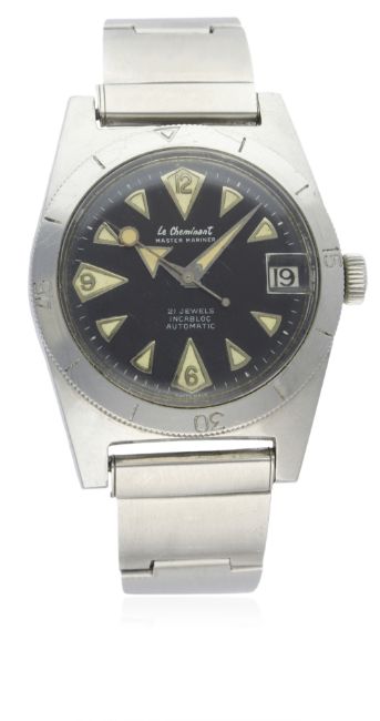 A GENTLEMAN'S STAINLESS STEEL LE CHEMINANT MASTER MARINER BRACELET WATCH CIRCA 1960s D: Black dial with large luminous inlaid silver markers & broad arrow hands, "lollipop" seconds hand, date aperture. M: 21 jewel automatic movement, . C: Tonneau shaped screw back case with 60 minute rotating bezel, case width measures approx. 36mm. B: Stainless steel bracelet. CONDITION REPORT D: Original dial in excellent condition. M: Working at present. C: In excellent condition, with light scratches due to general use . B: In excellent condition with light scratches. D: Dial / M: Movement / C: Case / S: Strap / B: Bracelet