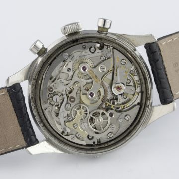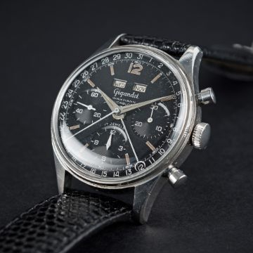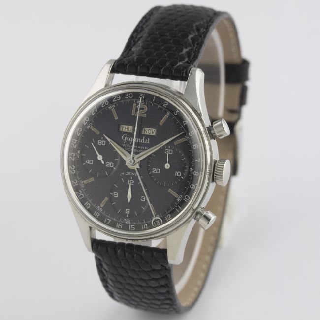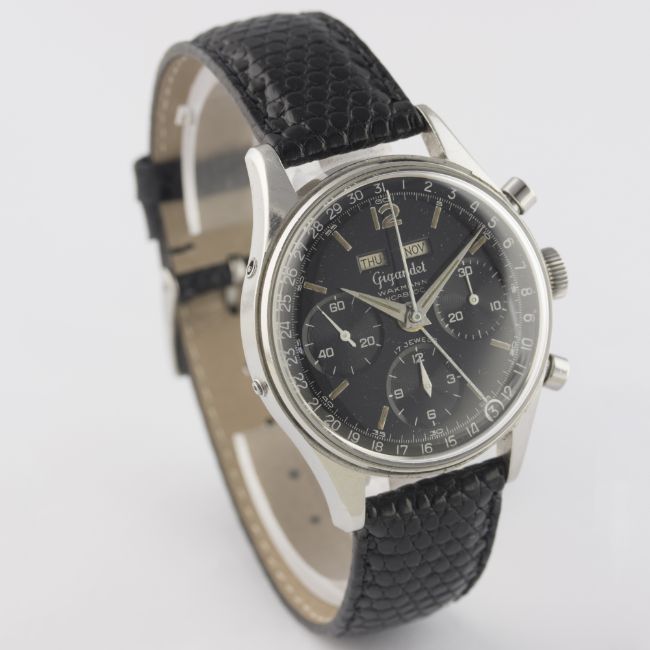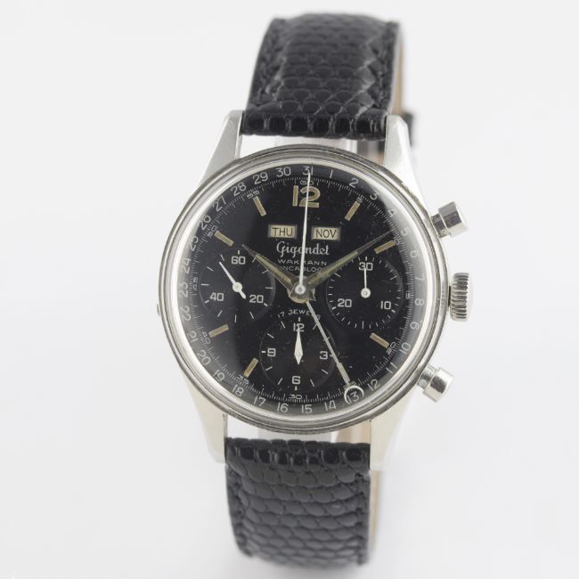 A RARE GENTLEMAN’S STAINLESS STEEL GIGANDET WAKMANN TRIPLE CALENDAR CHRONOGRAPH WRIST WATCH CIRCA 1960s D: Gloss black dial with luminous markers & dauphine hands, triple register recording hours, minutes and continuous seconds, day & month apertures, outer date calendar. M: 17 jewel manual wind movement signed Wakmann Watch Co Inc, Valjoux calibre 72C. C: Circular screw back case, signed Charles Gigandet, case diameter measures approx. 36mm. S: Black leather strap.CONDITION REPORT D: Original dial in excellent condition, showing some very small signs of age. M: Working at present. C: In very good condition, with some small scratches & wear due to general use. S: New. D: Dial / M: Movement / C: Case / S: Strap / B: Bracelet