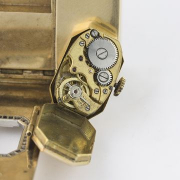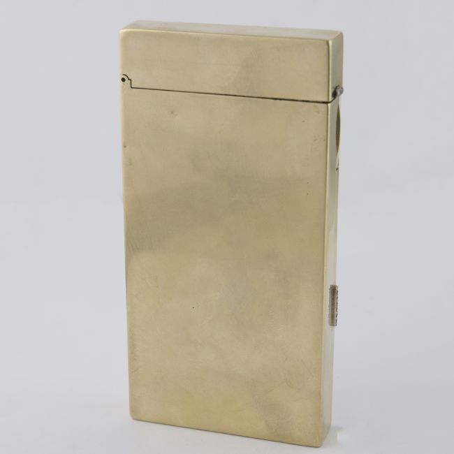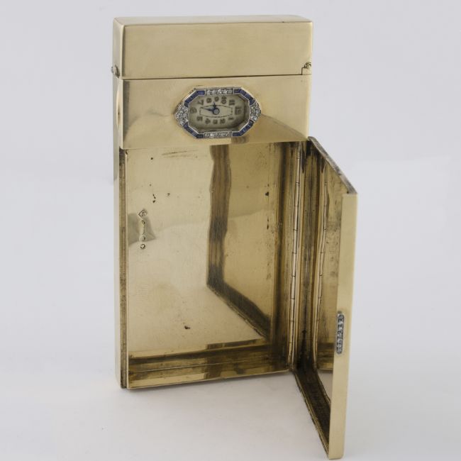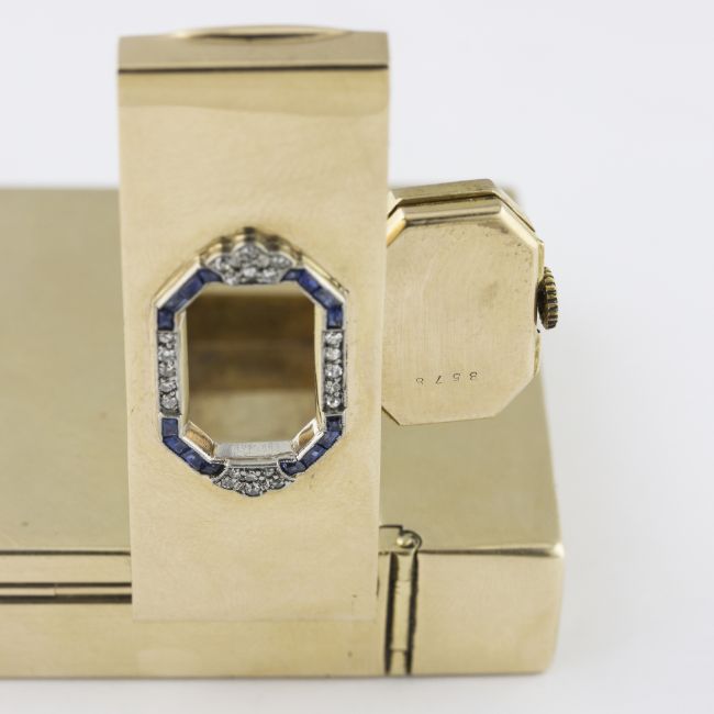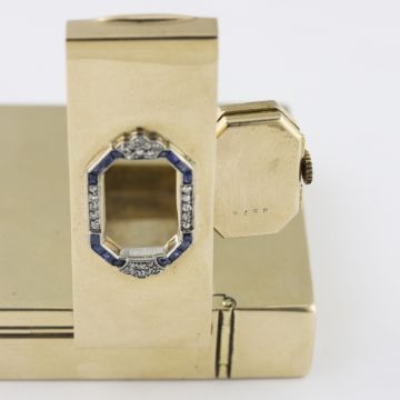 A FINE & RARE 9CT SOLID GOLD DUNHILL COMPENDIUM COMPACT CIGARETTE CASE & LIGHTER CIRCA 1927, SIGNED BANDO D: Silver dial with gilt Arabic numerals & inner minute track. M: Manual wind movement. C: Rectangular shaped case signed Bango, AD & 9ct hallmarks, original set diamond and sapphire bezel, diamond mounted thumb pieces with hinged doors to conceal the cigarette case and lighter, lighter has a roller mechanism with a straight hinged arm, total weight approx 156 grams.CONDITION REPORT D: Dial in fair condition. M: Watch movement not working at present. C: In very good condition with some wear and scratches due to general use. D: Dial / M: Movement / C: Case / S: Strap / B: Bracelet