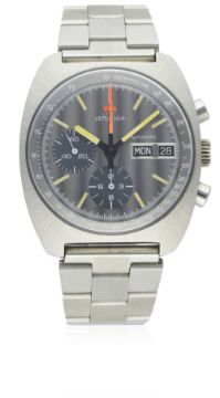 A RARE GENTLEMAN'S STAINLESS STEEL LEMANIA AUTOMATIC CHRONOGRAPH BRACELET WATCH CIRCA 1970s WITH ORIGINAL BOX D: Brushed grey dial with luminous markers & hands, double register recording hours & continuous seconds, centre "jet" hand recording minutes, inner tachymetre bezel, day & date apertures. M: 17 jewel automatic movement, numbered, calibre 5100. C: Tonneau shaped case, numbered, case width measures approx. 38mm. B: Stainless steel bracelet.CONDITION REPORT D: Original dial in excellent condition. M: Working at present. C: In excellent condition. B: In excellent condition. D: Dial / M: Movement / C: Case / S: Strap / B: Bracelet