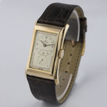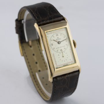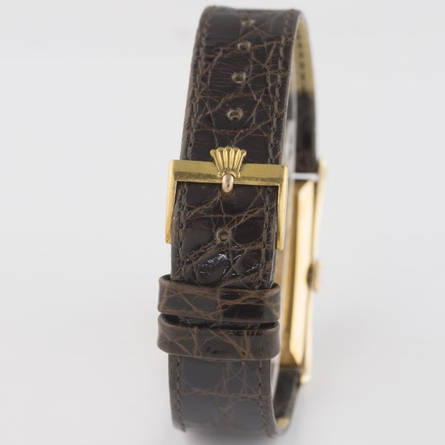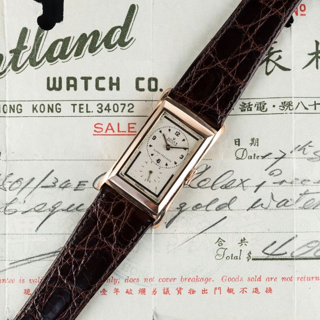 A FINE & RARE GENTLEMAN'S 9CT SOLID PINK GOLD ROLEX PRINCE BRANCARD SUPER PRECISION WRIST WATCH CIRCA 1940s, REF. 1490 WITH ORIGINAL PURCHASE RECEIPT FROM HONG KONG DATED 1955 MATCHING CASE BACK INSCRIPTION D: Two tone silver duo-dial with quarterly Arabic numerals & "arrow head" markers, subsidiary seconds. M: 18 jewel manual wind chronometer movement with "swan" neck regulator, signed Rolex Timed 6 Positions. C: Flared rectangular case, signed Rolex, hallmarked & numbered, case measures approx. 42mm by 25mm at its widest point. S: Brown leather strap with original Rolex gold plated pin buckle.CONDITION REPORT D: Original dial in excellent condition showing small signs of age. M: Working at present. C: In excellent condition. S: New. D: Dial / M: Movement / C: Case / S: Strap / B: Bracelet