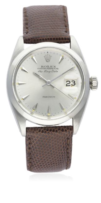 A GENTLEMAN'S STAINLESS STEEL ROLEX OYSTER PERPETUAL AIR KING DATE PRECISION WRIST WATCH CIRCA 1967, REF. 5700 D: Rare silver dial with faceted silver "dagger" batons, date aperture. M: 26 jewel automatic movement signed Montres Rolex S.A., calibre 1520. C: Oyster case, signed Montres Rolex S.A., numbered, dated I.67, Rolex crown, case diameter measures approx. 35mm. S: Brown leather strap. CONDITION REPORT D: Original dial in excellent condition. M: Working at present. C: In excellent condition, with some light scratches due to general use. S: New. D: Dial / M: Movement / C: Case / S: Strap / B: Bracelet