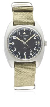 A GENTLEMAN'S STAINLESS STEEL BRITISH MILITARY RAF HAMILTON GENEVE PILOTS WRIST WATCH DATED 1974 D: Black dial with Arabic numerals & tritium luminous markers, military arrow. M: Manual wind movement with hacking seconds, signed Hamilton. C: Tonneau shaped military case, issue markings ^ 6BB/5238290 1944/74, case width measures approx. 36mm. S: NATO strap.CONDITION REPORT D: Original dial in excellent condition. M: Working at present. C: In very good condition. S: In excellent condition. D: Dial / M: Movement / C: Case / S: Strap / B: Bracelet