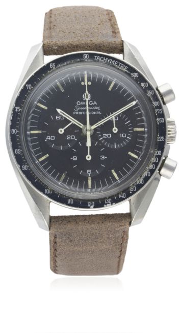 A GENTLEMAN'S STAINLESS STEEL OMEGA SPEEDMASTER PROFESSIONAL CHRONOGRAPH WRIST WATCH CIRCA 1971, REF. 145.022 ST 71 D: Black "stepped" dial with luminous markers & hands, triple register recording hours, minutes & continuous seconds. M: 17 jewel manual wind movement, signed Omega & numbered, calibre 861. C: Circular case with tachymetre bezel, signed Omega Watch Co., Speedmaster emblem embossed on case back with NASA moon landing tribute, dust cover, Omega crown & pushers, case diameter measures approx. 42mm. S: Distressed leather strap.CONDITION REPORT D: Original dial in very good condition, showing some signs of age. M: Working at present. C: In very good condition, with some small scratches due to general use. S: In excellent condition. D: Dial / M: Movement / C: Case / S: Strap / B: Bracelet