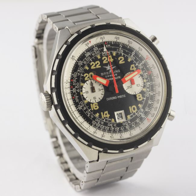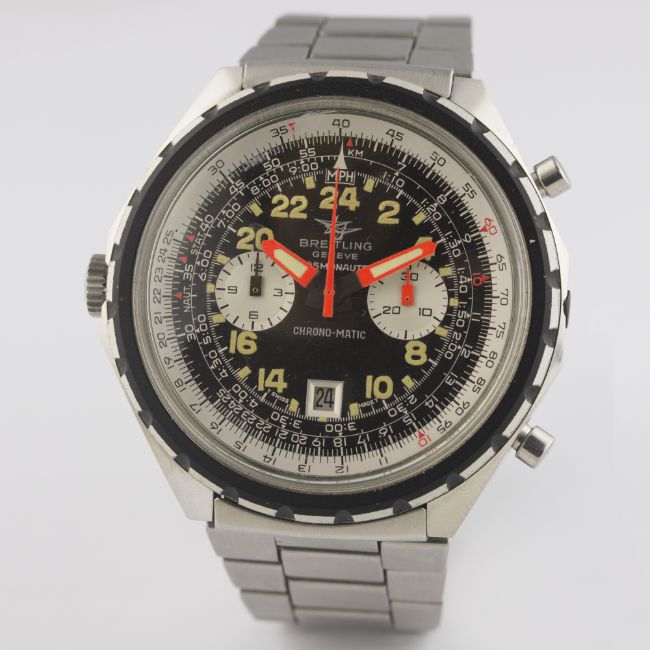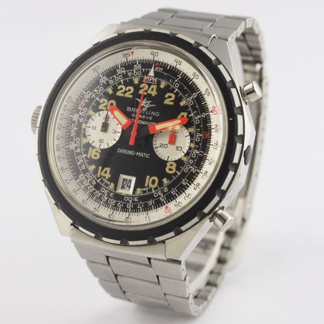A RARE GENTLEMAN'S STAINLESS STEEL BREITLING CHRONO MATIC COSMONAUTE CHRONOGRAPH BRACELET WATCH CIRCA 1970s, REF. 1809 D: Black dial with luminous 24 hour Arabic numerals, two silver registers recording minutes & hours, date aperture, inner rotating slide rule bezel, luminous inlaid orange hands. M: 17 jewel automatic movement signed Breitling, calibre 11. C: Large case, signed Breitling & numbered, Breitling crown, case width measures approx. 48mm. B: Original Breitling stainless steel bracelet.CONDITION REPORT D: Original dial in excellent condition. M: Working at present. C: In excellent condition, with some light scratches due to general use. B: In excellent condition, with light scratches. D: Dial / M: Movement / C: Case / S: Strap / B: Bracelet
