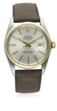 A GENTLEMAN'S STEEL & GOLD ROLEX OYSTER PERPETUAL DATEJUST WRIST WATCH CIRCA 1985, REF. 16013  D: Silver dial with gilt batons & hands, date aperture. M: 27 jewel automatic chronometer movement with quick set date, signed Rolex S.A. & numbered, calibre 3035. C: Oyster case with solid gold fluted bezel, signed Montres Rolex S.A., numbered, Rolex crown, case diameter measures approx. 36mm. S: Leather strap.CONDITION REPORT D: Original dial in excellent condition, with some small signs of age. M: Working at present. C: In very good condition. S: In excellent condition. D: Dial / M: Movement / C: Case / S: Strap / B: Bracelet