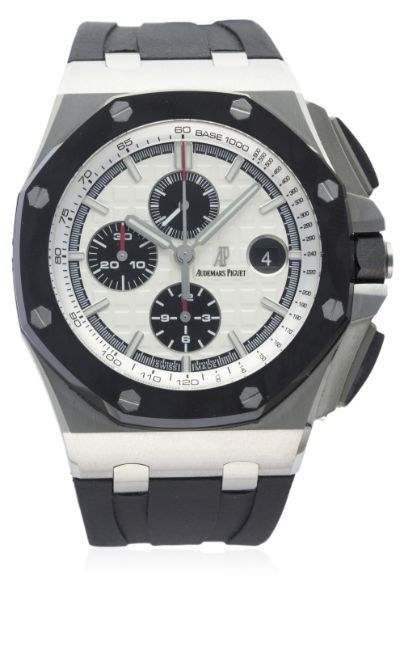// WITHDRAWN FROM AUCTION // A GENTLEMAN'S STAINLESS STEEL & CERAMIC AUDEMARS PIGUET ROYAL OAK OFFSHORE AUTOMATIC CHRONOGRAPH WRIST WATCH CIRCA 2014, UNWORN WITH ORIGINAL BOX, BOOKLETS & PAPERWORK D: Embossed silver dial with luminous inlaid silver batons & hands, three black registers recording hours, minutes & continuous seconds, date aperture, black surround with tracking, inner tachymetre bezel. M: 59 jewel automatic movement, signed Audemars Piguet, calibre 2326/2840. C: Stainless steel case with ceramic octagonal shaped bezel, exhibition back signed Royal Oak Offshore & numbered, original crown & pushers, case width measures approx. 45mm. S: Original AP black rubber strap & pin buckle.CONDITION REPORT D: Original dial in mint condition. M: Working at present. C: In mint condition. S: In mint condition. Overall the watch appears unworn. D: Dial / M: Movement / C: Case / S: Strap / B: Bracelet