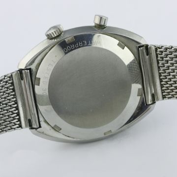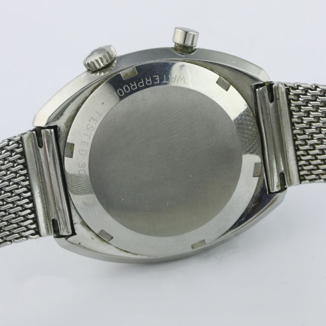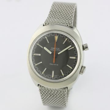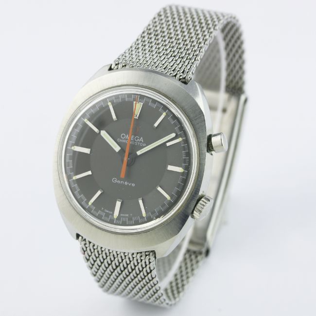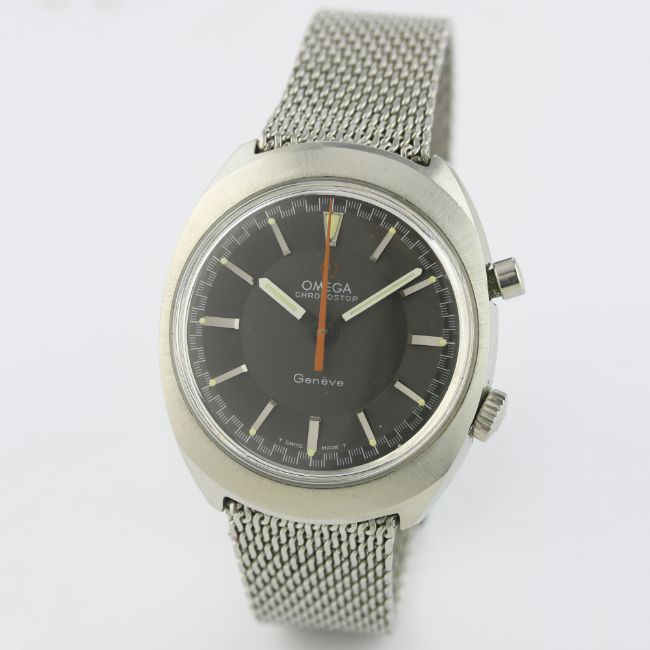 A GENTLEMAN'S STAINLESS STEEL OMEGA CHRONOSTOP BRACELET WATCH CIRCA 1969, REF. 146.009 / 146.010 D: Grey dial with silver batons & "chequered flag" tracking, orange centre chronograph hand. M: 17 jewel manual wind movement, signed Omega & numbered, calibre 920. C: Tonneau shaped case, signed Omega Watch Co., Omega crown & pusher, case width measures approx. 35mm. B: Original Omega stainless steel mesh bracelet, numbered 1120/116.CONDITION REPORT D: Original dial in excellent condition. M: Working at present. C: In excellent condition, with some light scratches due to occasional use. B: In excellent condition. D: Dial / M: Movement / C: Case / S: Strap / B: Bracelet