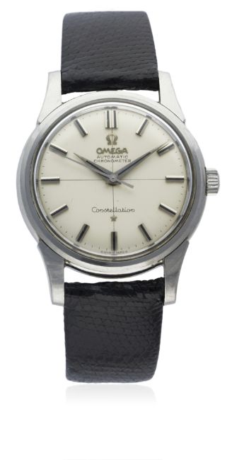 A GENTLEMAN'S STAINLESS STEEL OMEGA CONSTELLATION CHRONOMETER WRIST WATCH CIRCA 1960, REF. 14381 11 SC D: Silver crosshair dial with black inlaid silver batons & dauphine hands. M: 24 jewel automatic movement, signed Omega Watch Co. & numbered, calibre 551. C: Circular case, signed Omega Watch Co., gold capped Constellation badge on case back, Omega crown, case diameter measures approx. 35mm. S: Leather strap.CONDITION REPORT D: Original dial in excellent condition. M: Working at present. C: In very good condition, with some small scratches due to general use. S: In excellent condition. D: Dial / M: Movement / C: Case / S: Strap / B: Bracelet