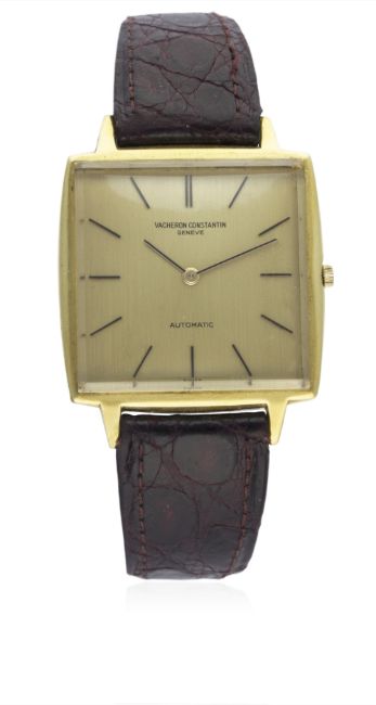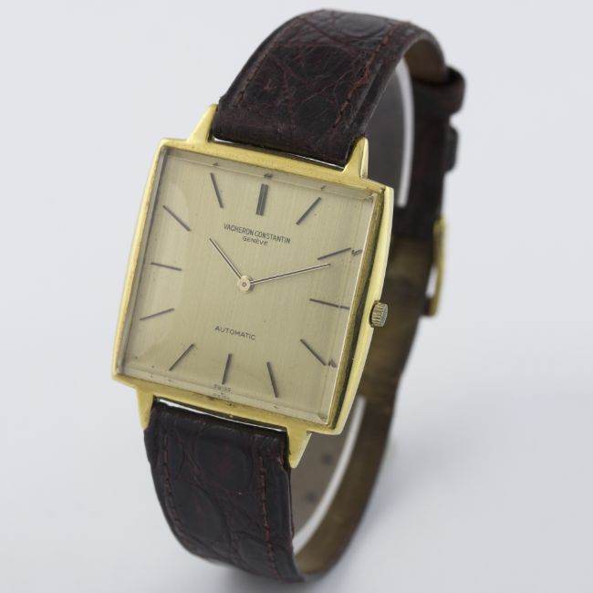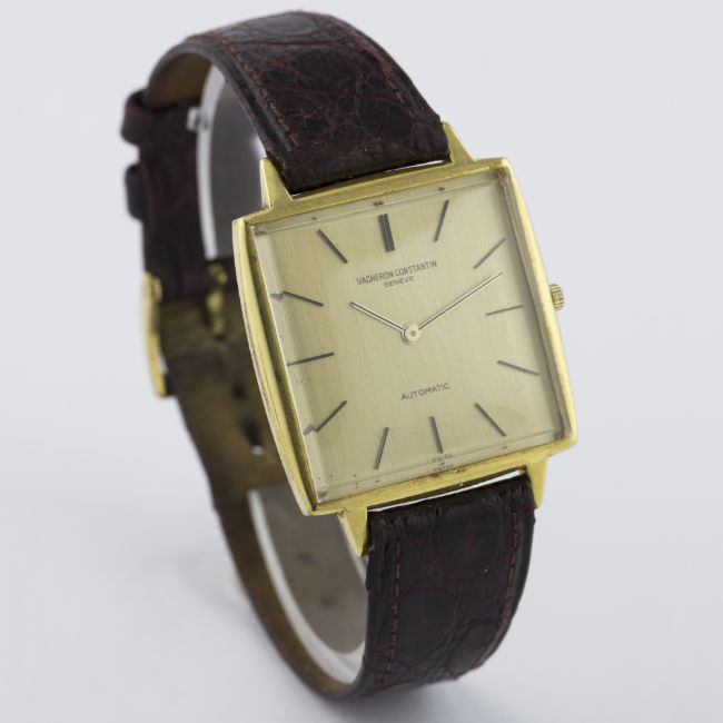 A GENTLEMAN'S 18K SOLID GOLD VACHERON & CONSTANTIN AUTOMATIC WRIST WATCH CIRCA 1970s, REF. 7614 WITH ORIGINAL V&C BOX D: Champagne dial with gilt batons. M: 36 jewel automatic movement with 21k gold rotor weight, signed Vacheron & Constantin & numbered, calibre K1120. C: Square shaped case, signed Vacheron & Constantin, numbered, 18k hallmarks, case width measures approx. 32mm. S: Brown leather strap. CONDITION REPORT D: Original dial in very good condition. M: Working at present. C: In very good condition, with some scratches and wear due to general use. S: In fair condition. D: Dial / M: Movement / C: Case / S: Strap / B: Bracelet