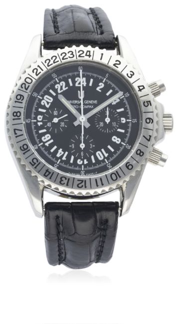 A GENTLEMAN'S STAINLESS STEEL UNIVERSAL GENEVE AERO COMPAX CHRONOGRAPH WRIST WATCH CIRCA 1990s, REF. 882.424 D: Black dial with 24 hour luminous Arabic numerals & markers, triple register recording hours, minutes & continuous seconds. M: 18 jewel manual wind movement signed Universal Geneve & numbered, Lemania calibre 1875. C: Circular screw back case, rotating 24 hour bezel, signed Universal Geneve & numbered, original crown & pushers, case diameter measures approx. 39mm. S: Original UG black leather strap & stainless steel folding clasp.CONDITION REPORT D: Original dial in excellent condition. M: Working at present. C: In excellent condition with some light scratches, bezel has some light surface scratches. S: In good condition. D: Dial / M: Movement / C: Case / S: Strap / B: Bracelet