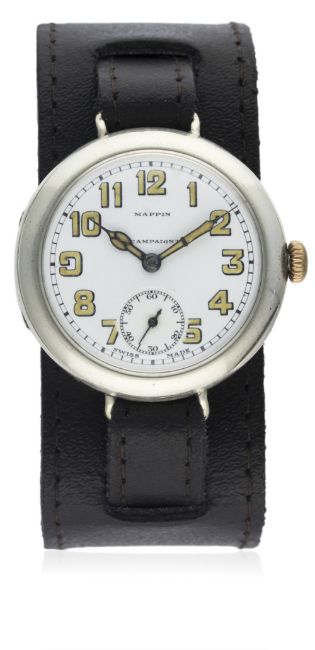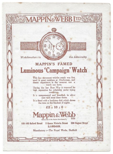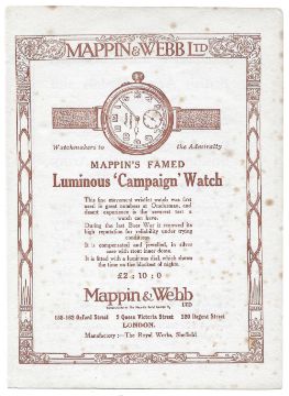 A RARE GENTLEMAN'S SOLID SILVER MAPPIN "CAMPAIGN" OFFICERS WRIST WATCH CIRCA 1918 WITH ORIGINAL ADVERT D: White enamel dial with luminous Arabic numerals & cathedral hands, subsidiary seconds. M: 15 jewel manual wind Swiss movement signed B&Co. C: Circular hinged case, signed A.B, hallmarked & numbered, case diameter measures approx. 35mm. S: Brown leather military style strap.  CONDITION REPORT D: Original dial in excellent condition. M: Working at present. C: In excellent condition, with some light scratches due to general use. S: In very good condition. D: Dial / M: Movement / C: Case / S: Strap / B: Bracelet
