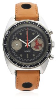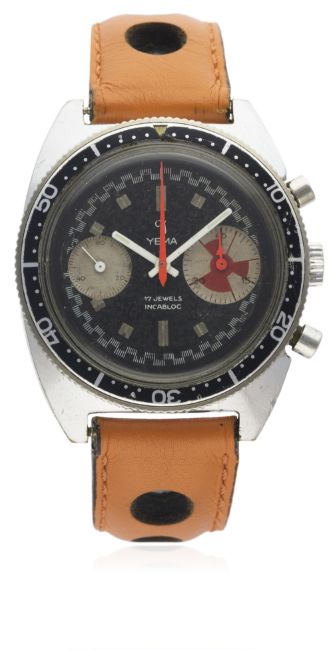A GENTLEMAN’S STAINLESS STEEL YEMA "BIG EYE" CHRONOGRAPH WRIST WATCH CIRCA 1960s D: Black dial with silver batons, outer chequered flag tracking, continuous seconds & large minute recorder. M: 17 jewel manual wind incabloc movement, Valjoux calibre 7734. C: Tonneau shaped case with 60 minute rotating bezel, stainless steel screw back, case width measures approx. 38mm. S: Orange leather racing strap.CONDITION REPORT D: Original dial in good condition, showing some signs of age. M: Working at present. C: In very good condition with some scratches and small marks due to general wear. S: In good condition. D: Dial / M: Movement / C: Case / S: Strap / B: Bracelet