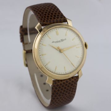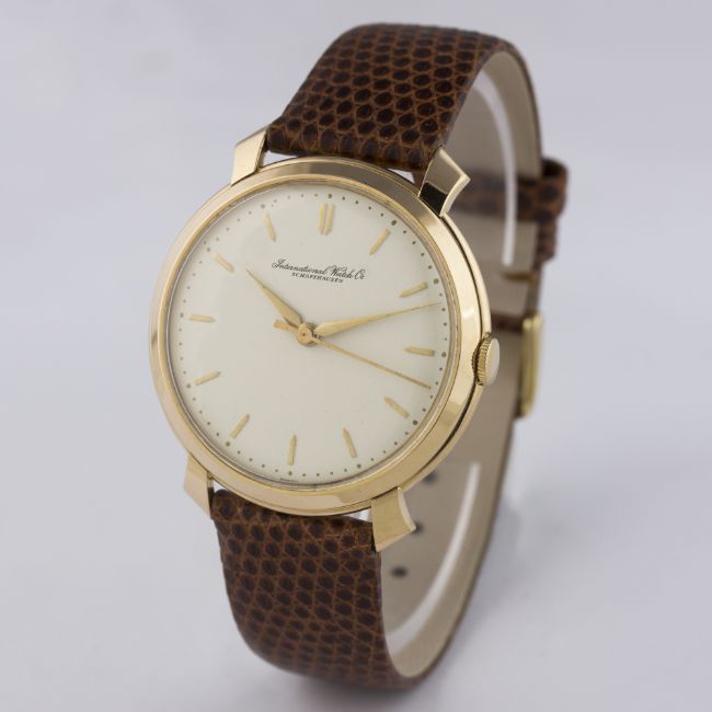 A GENTLEMAN'S LARGE SIZE 18K SOLID ROSE GOLD IWC SCHAFFHAUSEN WRIST WATCH CIRCA 1950s D: Silver dial with gilt batons & ''dagger'' hands. M: 17 jewel manual wind movement, signed International Watch Co. & numbered, calibre 89. C: Circular case with flared lugs, signed IWC, hallmarked & numbered, case diameter measures approx. 37mm. S: Brown leather strap.CONDITION REPORT  D: Dial in excellent condition. M: Working at present. C: In excellent condition. S: New.  D: Dial / M: Movement / C: Case / S: Strap / B: Bracelet