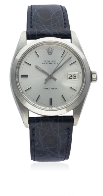 A GENTLEMAN'S STAINLESS STEEL ROLEX OYSTERDATE PRECISION WRIST WATCH CIRCA 1971, REF. 6694 D: Silver sunburst dial with silver batons & hands, date aperture. M: 17 jewel manual wind movement signed Montres Rolex S.A. & numbered, calibre 1225. C: Oyster case, signed Montres Rolex S.A., dated I.71, numbered, Rolex crown, case diameter measures approx. 35mm. S: Blue leather strap.CONDITION REPORT D: Dial in excellent condition. M: Working at present. C: In excellent condition. S: New. D: Dial / M: Movement / C: Case / S: Strap / B: Bracelet