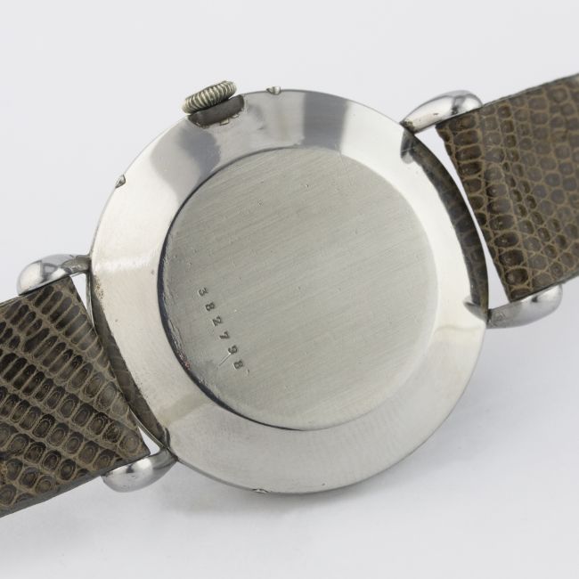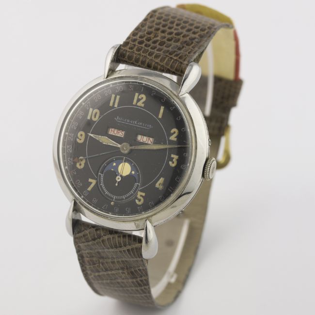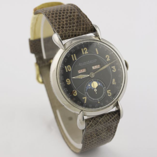 AN EXTREMELY RARE GENTLEMAN'S LARGE SIZE STAINLESS STEEL JAEGER LECOULTRE MOONPHASE TRIPLE CALENDAR WRIST WATCH CIRCA 1940s D: Black dial with luminous Arabic numerals, day & month apertures, moonphase display within subsidiary seconds, outer date calendar. M: Manual wind movement, signed Jaeger-LeCoultre & numbered, calibre P494/a. C: Circular case with "tear drop" lugs, signed Fab. Suisse & numbered, case diameter measures approx. 36mm. S: Grey leather strap.CONDITION REPORT D: Original dial in excellent condition, with some small signs of age. M: Working at present. C: In excellent condition, with some light scratches due to general use. S: In excellent condition. D: Dial / M: Movement / C: Case / S: Strap / B: Bracelet